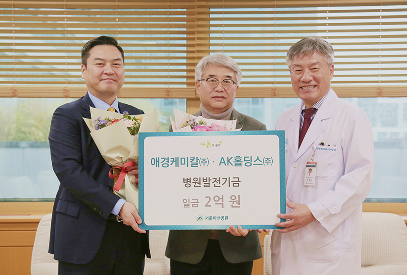 애경케미칼(주)·AK홀딩스(주)에서 병원발전기금 2억 원을 후원했다. 양 사는 지속적으로 후원하고 있고 누적 후원금은 총 10억 원이다. 2023년 12월 11일 진행된 감사패 증정식에는 표경원 애경케미칼(주) 대표, 백차현 AK홀딩스(주) 대표, 박승일 병원장 등이 참석했다.