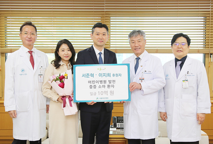 호텔·리조트 운영업체인 대명소노그룹의 서준혁 회장이 어린이병원 발전과 중증 소아 환자들을 위해 10억 원을 후원했다. 2024년 1월 5일 진행된 감사패 증정식에는 서준혁 회장, 배우자 이지희 님, 박승일 병원장, 고태성 어린이병원장, 최재원 대외협력실장 등이 참석했다.