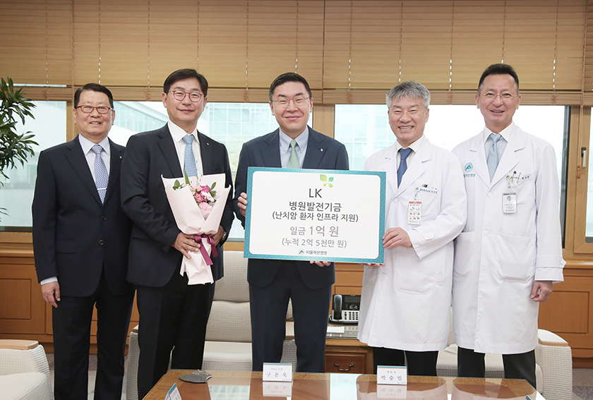 (주)LK 구본욱 대표가 난치암 환자 인프라 지원을 위하여 병원발전기금 1억 원을 후원했다. 구 대표는 2022년부터 지속적으로 후원하고 있고 누적 후원금은 총 2억 5천만 원이다. 2024년 4월 24일 진행된 감사패 증정식에는 구본욱 대표, 강두석 LK보험중개 대표, 이호영 LK보험중개 감사, 박승일 병원장, 최재원 대외협력실장 등이 참석했다.