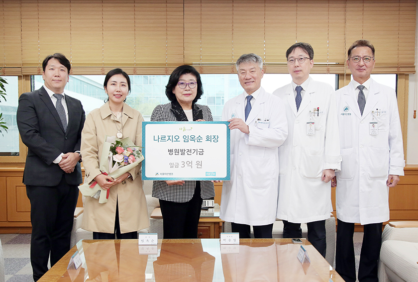 기능성 신발 제조업체인 나르지오의 임옥순 회장이 병원발전기금 3억 원을 후원했다. 2024년 10월 14일 진행된 감사패 증정식에는 임옥순 회장, 자녀 정지선 님, 사위 이재근 님, 박승일 병원장, 비뇨의학과 정인갑 교수, 최재원 대외협력실장 등이 참석했다.
