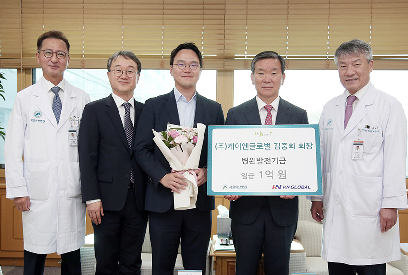건설업체인 케이엔글로벌의 김중희 회장이 병원발전기금 1억 원을 후원 했다. 2024년 10월 30일 진행된 감사패 증정식에는 김중희 회장, 김제균 본부장, 박승일 병원장, 최재원 대외협력실장 등이 참석했다.