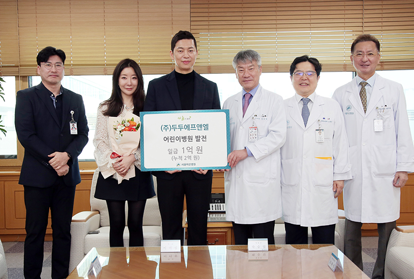 프리미엄 키즈 패션 브랜드인 ㈜두두에프앤엘 이미섭·조재현 대표가 어린이병원 발전기금 1억 원을 후원했다. 2024년 12월 20일 진행된 감사패 증정식에는 이미섭·조재현 대표, 박승일 병원장, 고태성 어린이병원장, 최재원 대외협력실장, 최경성 자재팀 UM 등이 참석했다.